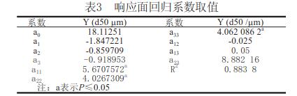 利用響應(yīng)面分析法[1]化枸杞子渣超微粉碎工藝參數(shù)。在單因素預(yù)試驗(yàn)基礎(chǔ)上,用SAS軟件系統(tǒng)進(jìn)行響應(yīng)面分析,設(shè)計(jì)一個(gè)三因素五水平的回歸方程來(lái)擬合因素和指標(biāo)(響應(yīng)值)之間的函數(shù)關(guān)系。選擇球料比(X1)、枸杞子渣漿液濃度(X2)和攪拌器轉(zhuǎn)速(X3)作為因素,以粉碎后的顆粒粒度d50作為響應(yīng)值對(duì)球磨機(jī)濕法超微粉碎工藝進(jìn)行化。
